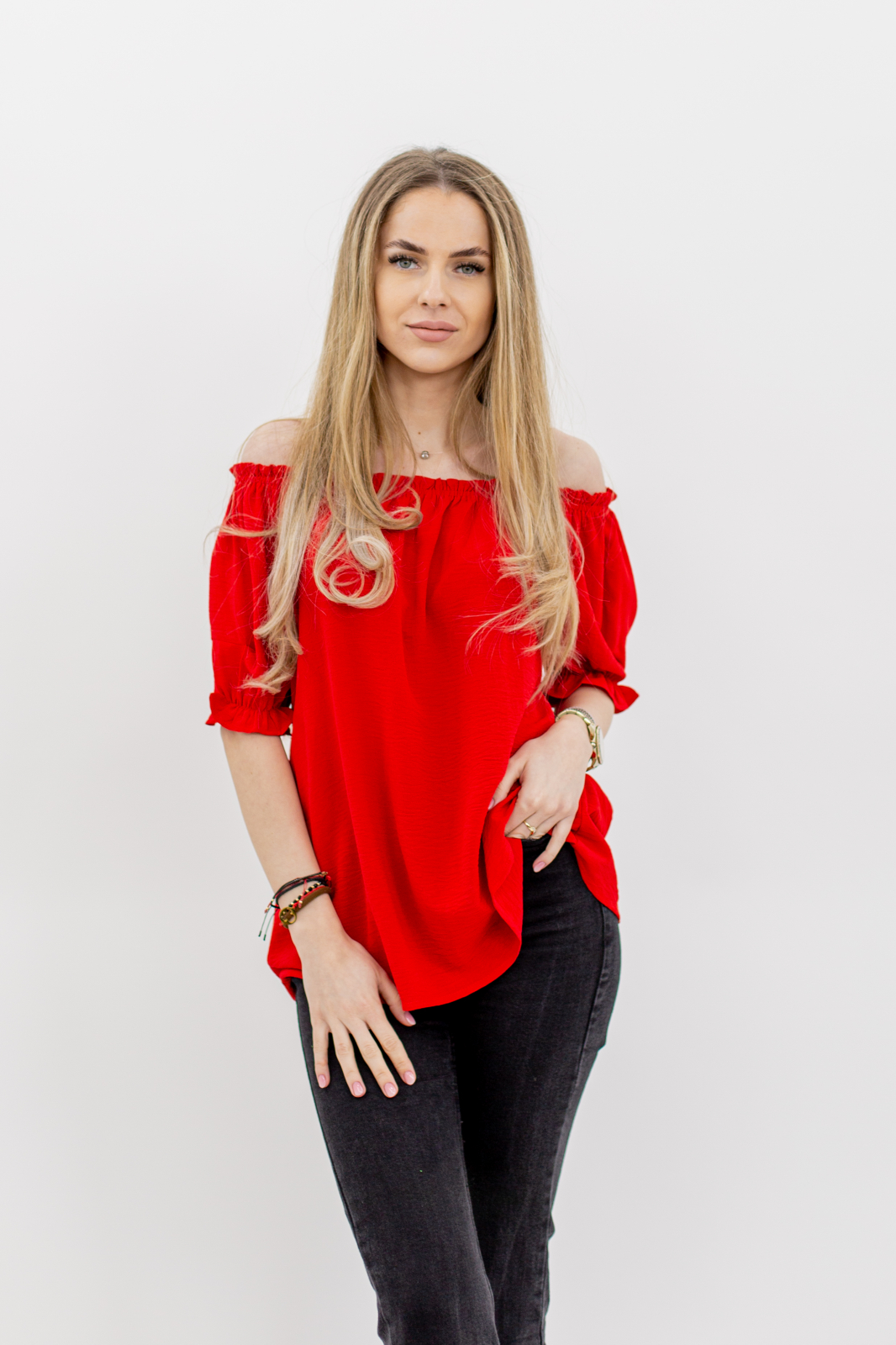 - Decolteul rotund cu elastic permite purtarea acestei bluze fie pe umeri, fie la baza gâtului, oferindu-ți opțiuni diferite pentru un look personalizat.