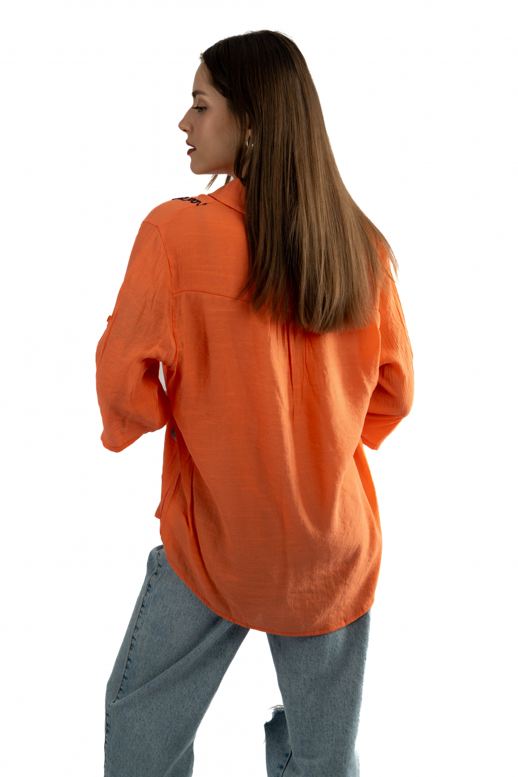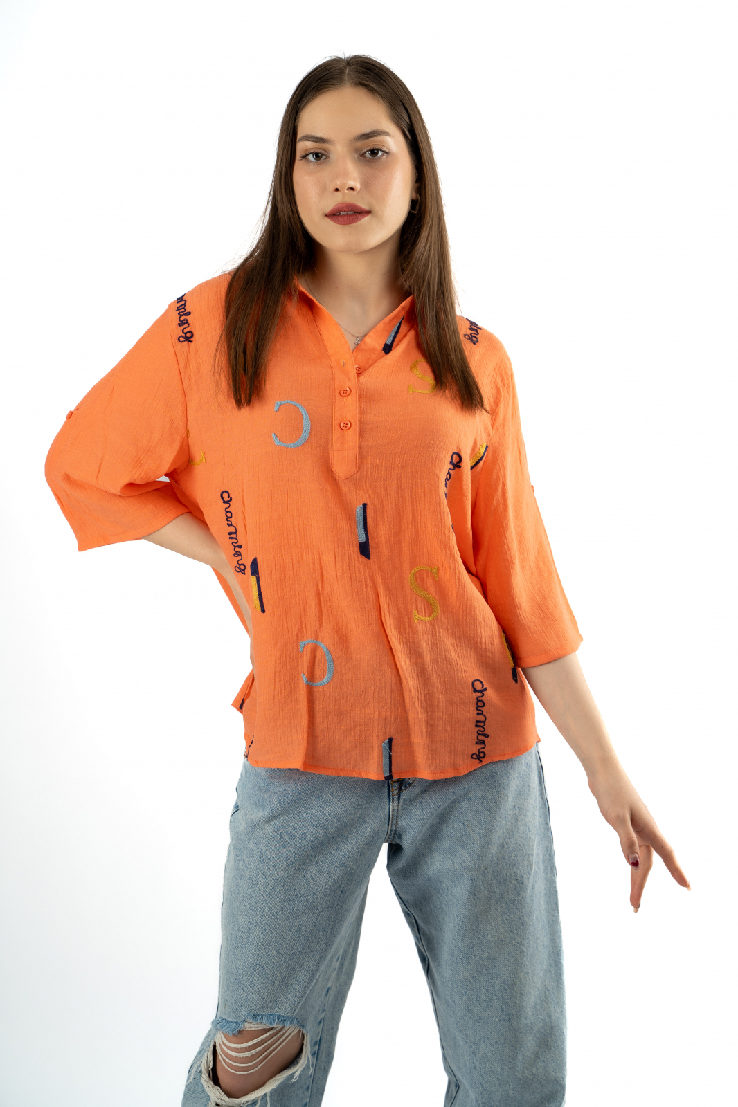 - Închiderea cu trei nasturi și croiul lejer completează designul, făcând această cămașă ușor de purtat și asortat.