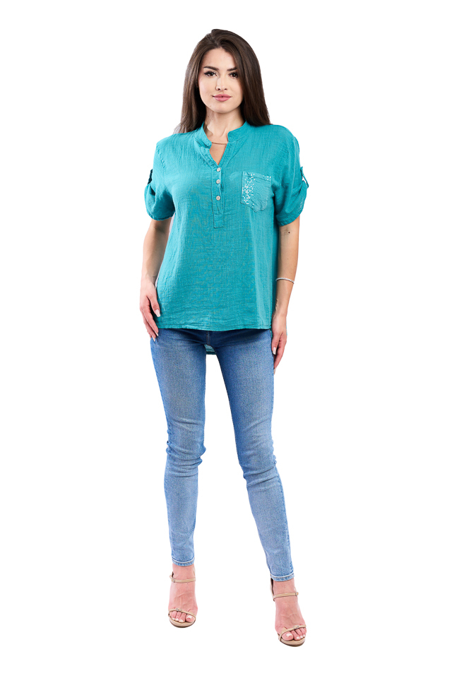 • Imprimeul uni si buzunarul decorat cu paiete conferă un aspect curat și rafinat, perfect pentru orice ocazie casual sau de birou.