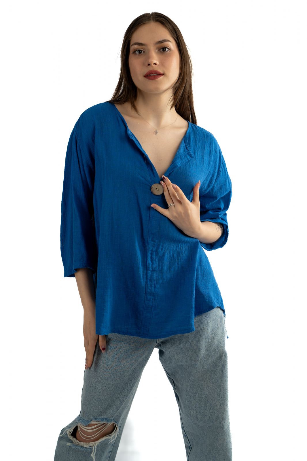 • Manecile trei sferturi și decolteul în V adaugă un look sofisticat, în timp ce croiul lejer asigură confortul necesar întregii zile.