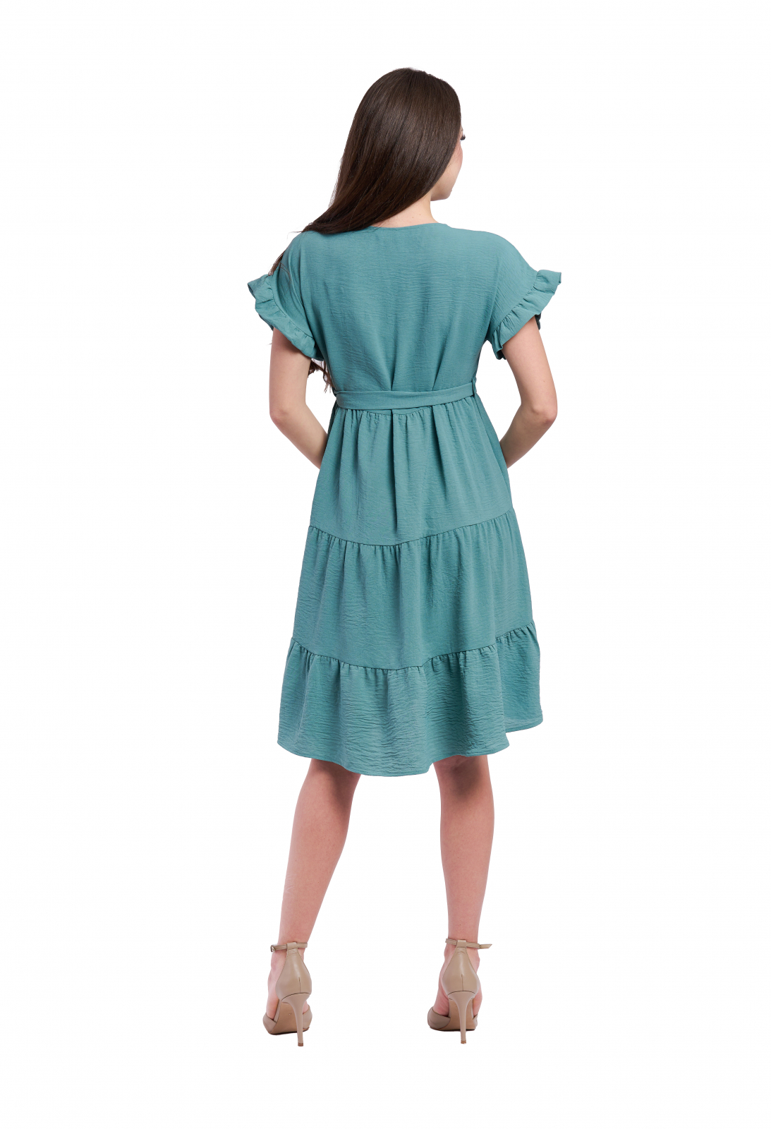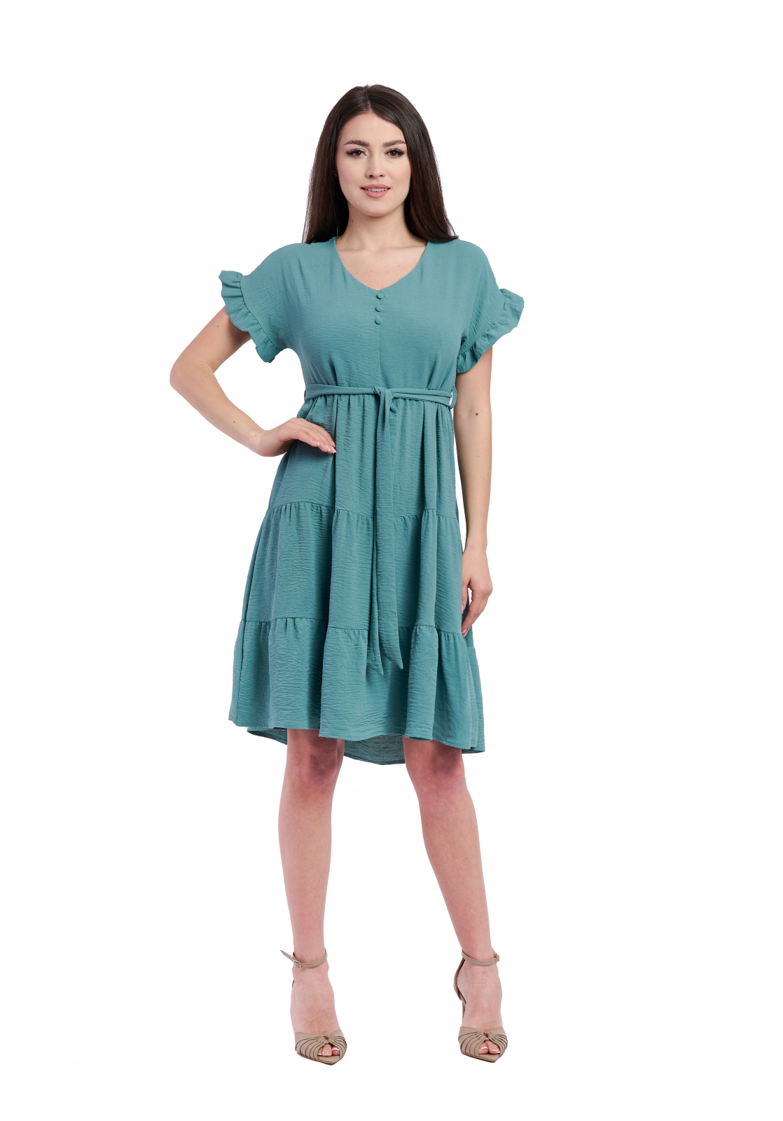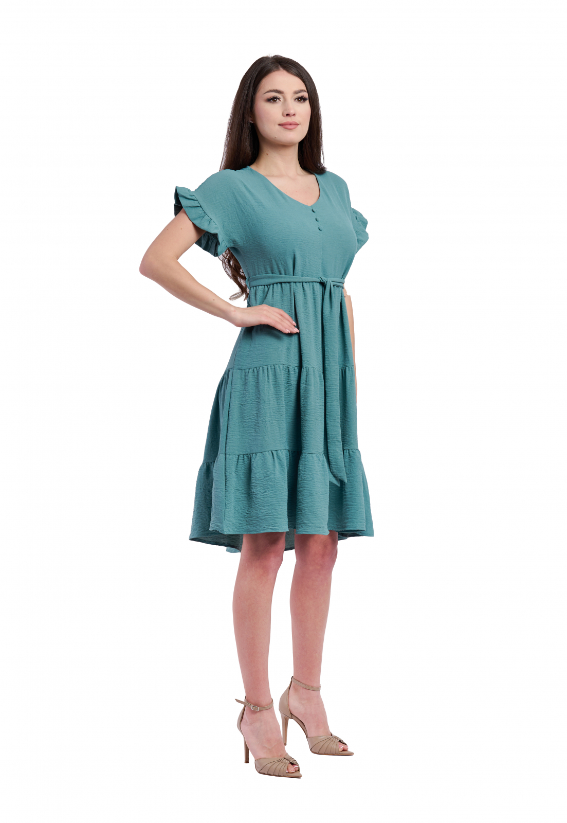 • Manecile scurte cu volane, nasturii ornamentali frontalisi  decolteul in V adaugă un aer feminin, iar cordonul detașabil din talie subliniază silueta, oferind un fit perfect.